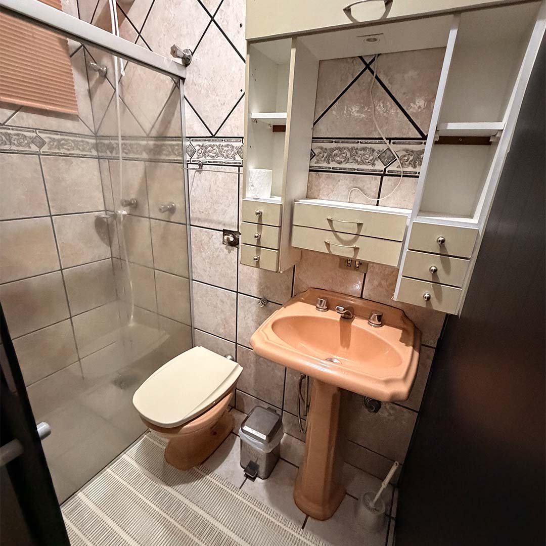 O grande diferencial deste quarto é o banheiro privativo com hidromassagem, perfeito para momentos de relaxamento. O banheiro é completo, equipado com chuveiro quente, box, espelho, armário, pia, além de suporte para shampoo, cremes e sabonete, oferecendo conforto, funcionalidade e privacidade.